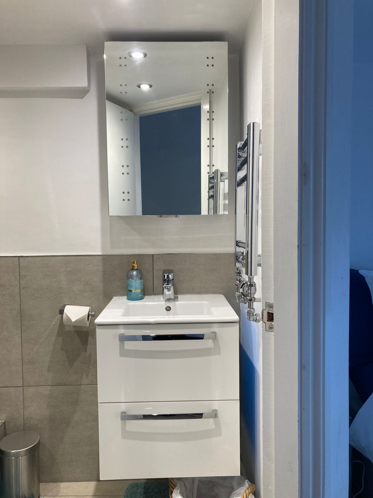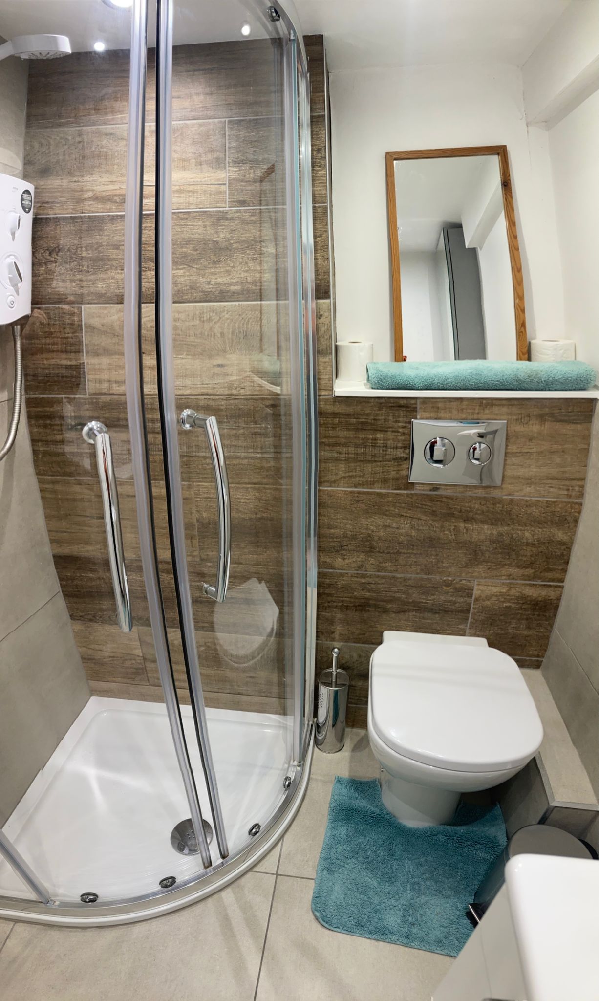 En-suite bathroom with electric shower, shower gel, shampoo & conditioner